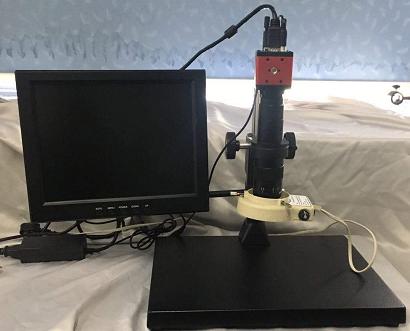 该设备用于外观观察,主要结构包括显微镜镜头、VGA相机、一体式环形光源、12寸显示器等。首先将产品放置显微镜镜头正下方载物台上,由显微镜镜头放大产品,通过VGA相机转换成电信号,最后通过显示器进一步的放大,该设备最小倍数18倍,最大倍数114倍。
