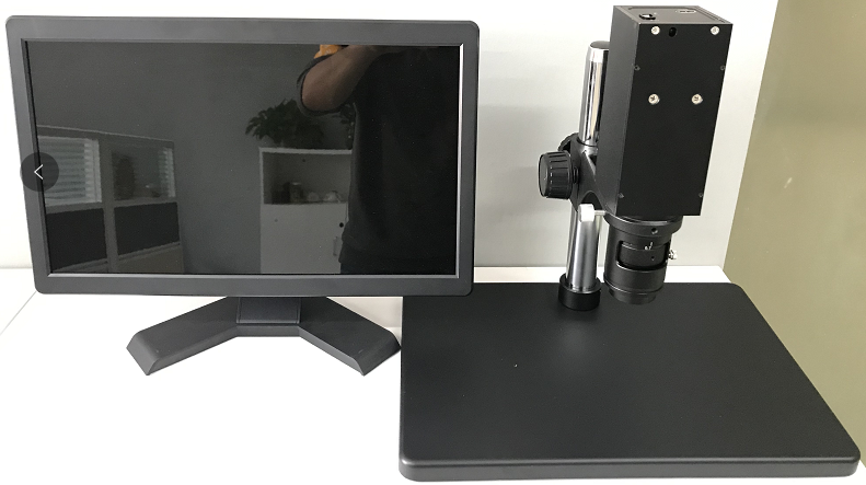 该设备用于外观观察,主要结构包括显微镜镜头、高清相机、高亮白色环形光源、17.3寸高清显示器等。首先将产品放置显微镜镜头正下方载物台上,由显微镜镜头放大产品,通过高清相机转换成电信号,最后通过高清显示器进一步的放大,该系统最小倍数15倍,最大倍数99倍。