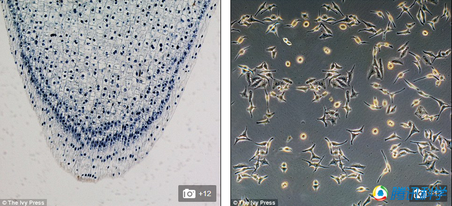 左图是玉米根茎的末端显微照片;右图是前列腺癌细胞。
